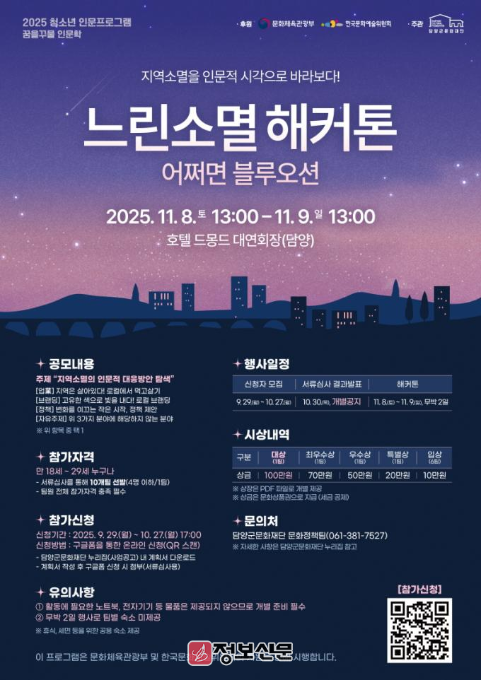 ![]() 담양군문화재단, 청소년 인문 프로그램 「느린소멸 해커톤」 참가팀 모집 |