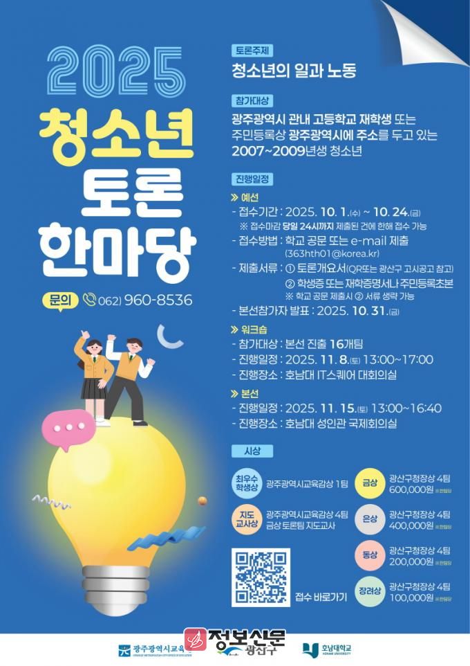 본선 진출팀은 11월 8일 워크숍을 통해 토론 주제 이해와 토론 기법을 배우고, 11월 15일 호남대학교 국제회의실에서 열리는 본선 무대에 오를 예정이다.