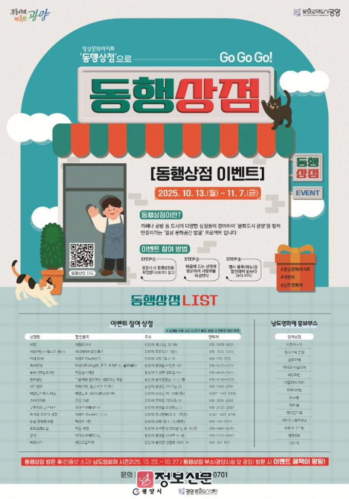 또한 10월 24일부터 26일까지 ‘남도영화제 시즌2’가 열리는 광양시청 앞 시민광장에서는 동행상점 홍보부스가 운영된다. 이 기간 14개소의 동행상점이 참여해 부스 방문객을 대상으로 SNS 이벤트를 실시하고, 다양한 물품을 증정하는 한편 홍보 리플렛도 배포할 예정이다.