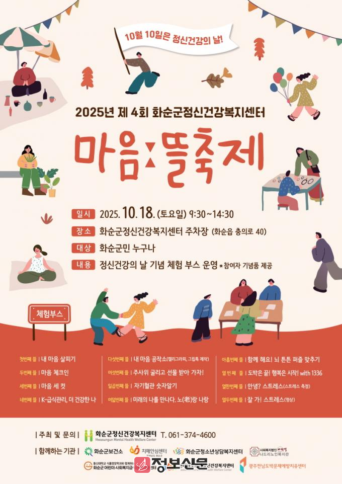 이번 축제는 화순군정신건강복지센터에서 10월 18일(토) 오전 9시 30분부터 오후 2시 30분까지 열리며, 지역 주민 누구나 무료로 참여할 수 있다.
