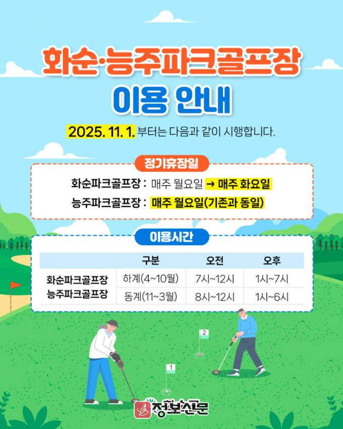 화순군은 화순파크골프장과 능주파크골프장이 매주 월요일 동시에 휴장하던 방식을 변경한다. 화순파크골프장은 매주 화요일에 휴장하고, 능주파크골프장은 기존대로 매주 월요일 휴장한다.