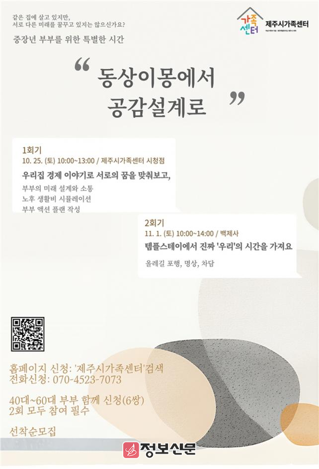 ![]() 제주시, 제주시가족센터와 중장년 부부 미래설계 프로그램 운영 |