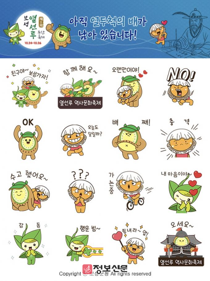이번 이모티콘 무료 배포는 10월 24일부터 3일 동안 열리는 ‘제1회 보성 열선루 이순신 역사문화축제’를 널리 알리기 위한 것으로, 보성의 대표 특산물인 녹차·꼬막·키위를 의인화한 캐릭터 BS삼총사를 귀엽고 익살스럽게 표현했다.