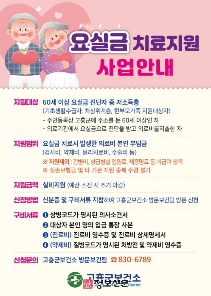 지원 대상은 고흥군에 주소를 둔 60세 이상 어르신 중 의료기관에서 요실금 진단을 받고 치료비를 지출한 ▲기초생활수급자 ▲차상위계층 ▲한부모가족 등 저소득층이다.