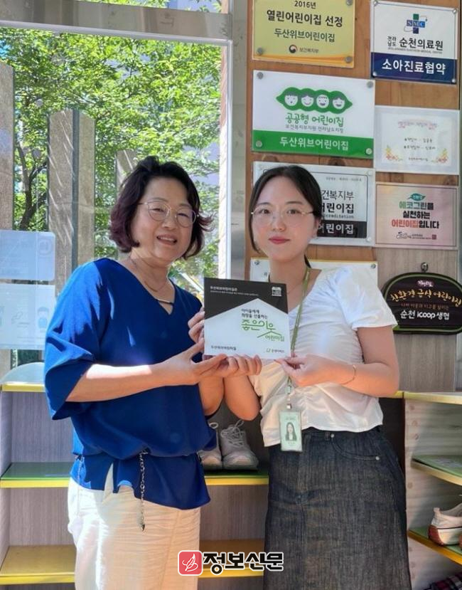 두산위브어린이집 김금숙 원장은 “이번 좋은이웃어린이집 협약을 통해 원아들이 세계시민으로 성장하는 뜻깊은 경험을 하게 되어 기쁘다”며“작은 나눔이 지역사회와 더불어 세상에 긍정적인 변화를 이끄는 힘이 되길 바란다”고 말했다.