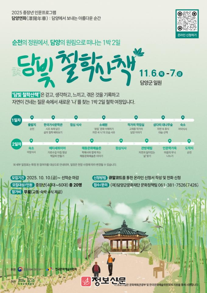![]() 담양군문화재단, 중장년 인문프로그램 「담빛 철학산책-담양편」 참가자 모집 |