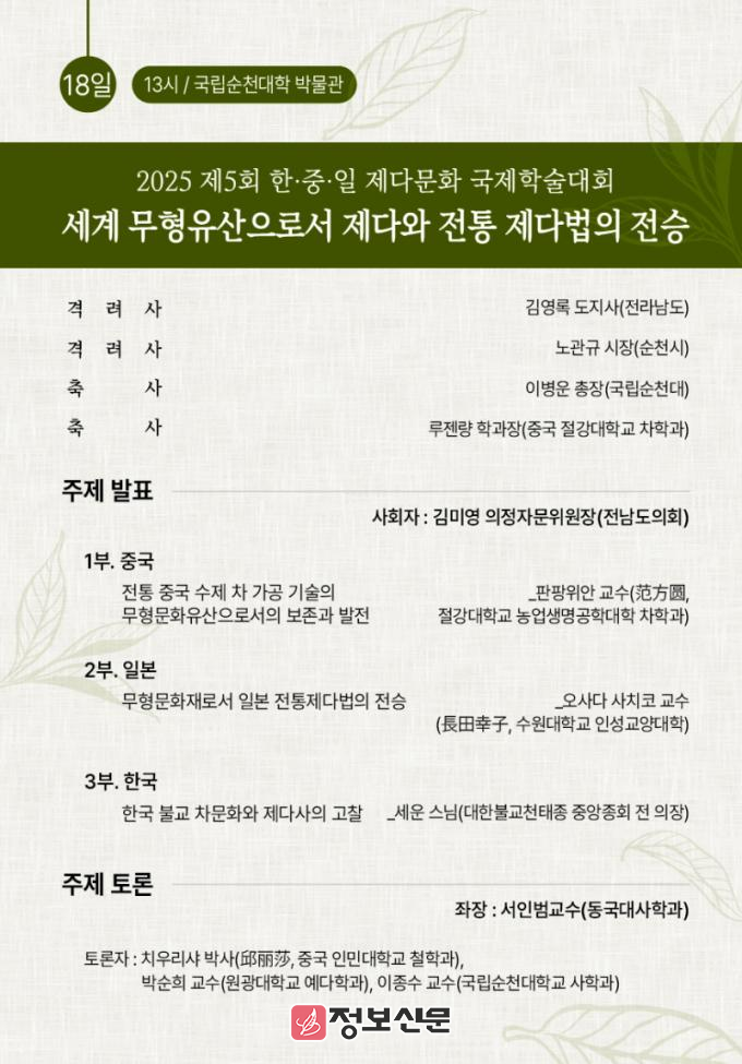 둘째 날인 18일 오후 1시에는 국립순천대학교 박물관에서 ‘제5회 한·중·일 제다문화 국제학술대회’가 열린다. ‘세계 무형유산으로서 제다와 전통 제다법의 전승’을 주제로 한국·중국·일본의 대표 연구자들이 제다문화를 학문적으로 비교·고찰한다.