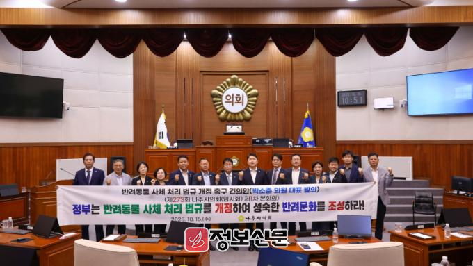 나주시의회는 건의안을 통해 ▲반려동물 사체를 폐기물이 아닌 장례의 개념으로 전환할 수 있는 법적 근거를 마련할 것과 ▲공공장례시설 확충 및 화장 장례비 지원 마련, ▲반려동물 입양 시 사체 처리를 포함한 윤리적 책임 교육을 의무화할 것을 강력히 촉구했다.