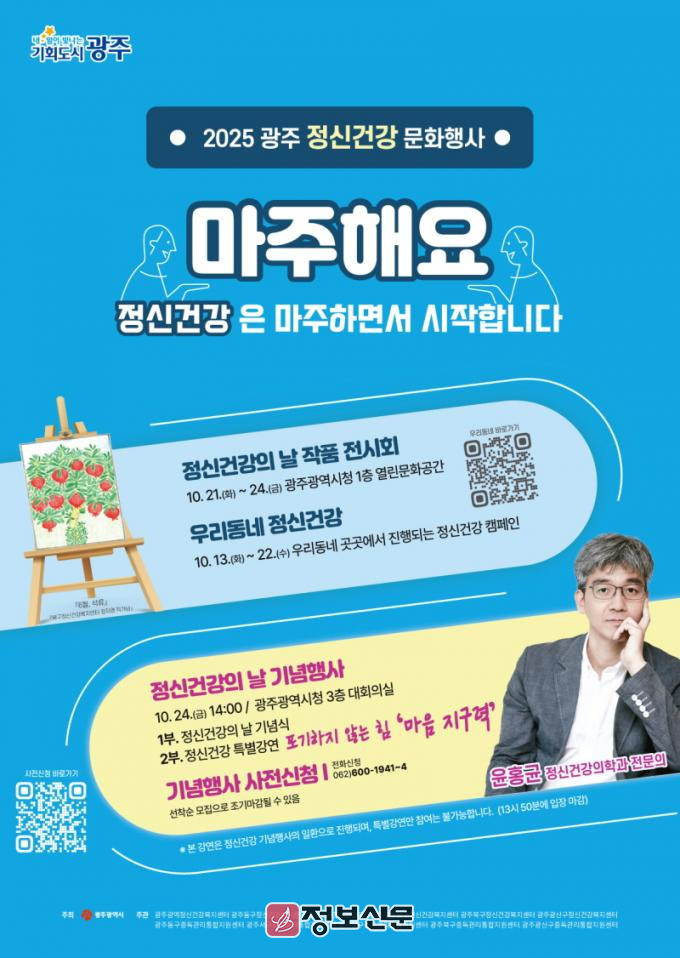 먼저 24일 오후 2시 시청 대회의실에서는 ‘정신건강의 날 기념행사’가 열린다. 이날 기념식에서는 정신건강 및 자살예방 유공자에 대한 시장 표창과 함께 ‘자존감 수업’ 저자이자 정신건강의학과 전문의 윤홍균 박사가 ‘포기하지 않는 힘, 마음 지구력’을 주제로 특강을 진행한다.