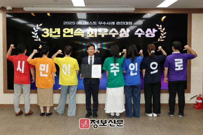 ![]() 광산구 ‘2025 전국 기초단체장 매니페스토 우수사례 경진대회’ 최우수상 기념사진. 광산구는 올해 동 미래발전계획의 우수성을 인정받아 3년 연속 최우수상의 쾌거를 달성했다. |