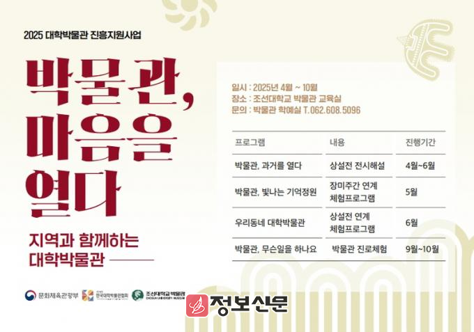 조선대학교 박물관은 (사)한국대학박물관협회가 주관하는 ‘2025 대학박물관 진흥지원사업’의 일환으로 ‘「박물관, 마음을 열다」-지역과 함께하는 대학박물관-’ 프로그램을 성황리에 마무리했다.