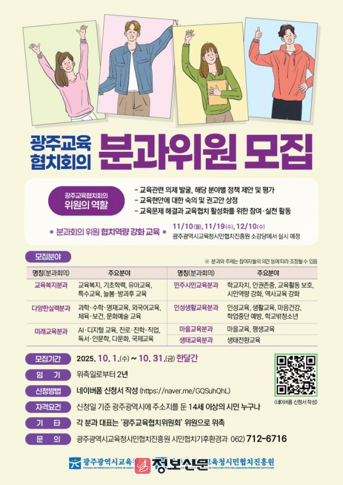 모집인원은 100명 내외이며, 광주교육에 관심 있는 14세 이상 광주시민이면 누구나 참여 가능하다. 2기 위원은 오는 11월부터 2027년 10월까지 2년간 ▲분과별 회의(상·하반기 각 2회) ▲대표회의(연 2회) ▲분과회의 연수(연 1회) 등에 참여하게 된다.