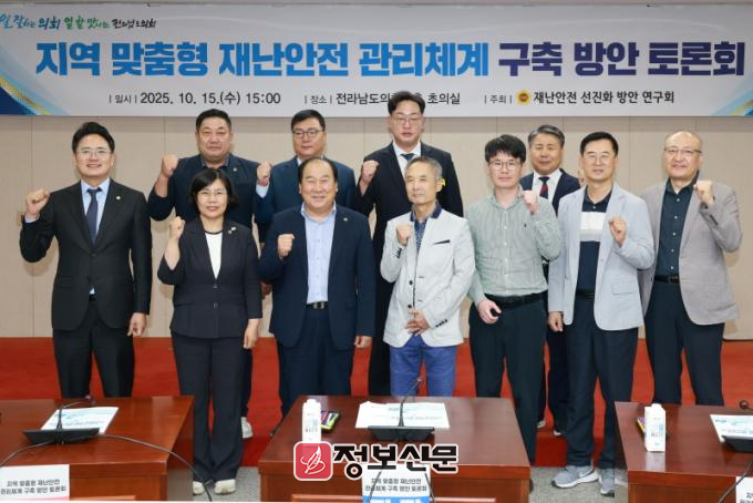 ![]() 10월 15일 전라남도의회 초의실에서 열린 ‘지역 맞춤형 재난안전 관리체계 구축 방안’ 토론회에서 참석자들이 기념촬영을 하고 있다. |