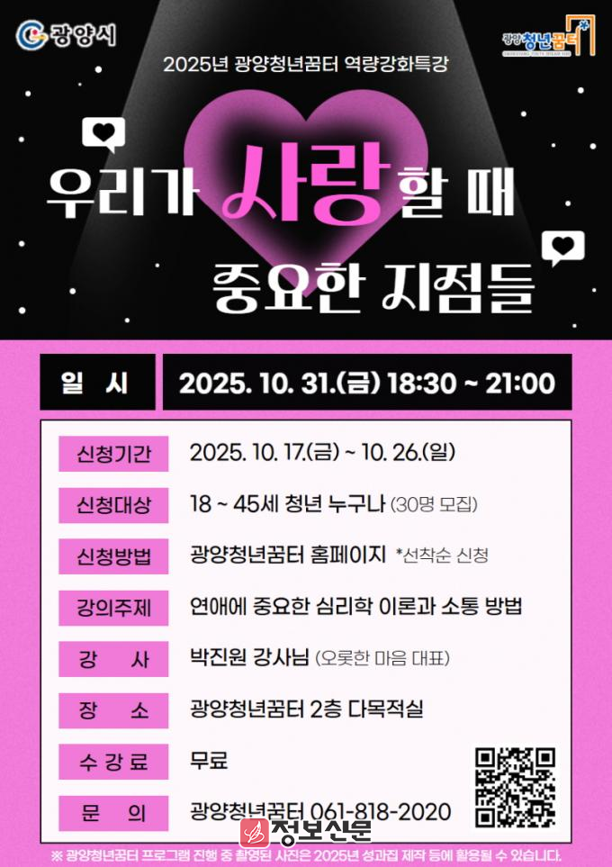 이번 특강은 만 18세부터 45세까지의 청년이라면 누구나 무료로 참여할 수 있으며, 10월 17일(금)부터 27일(월)까지 광양청년꿈터 누리집을 통해 선착순으로 신청을 받는다.