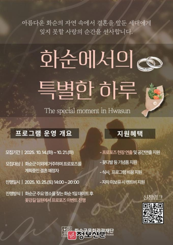 모집은 10월 14일(화)부터 10월 21일(화) 18:00까지로 화순군 외 지역에 거주하며 프로포즈를 계획 중인 커플 1팀을 모집한다. 신청은 별도의 폼 작성을 통한 온라인 접수로 가능하며, 최종선정자는 10월 22일(수) 개별 안내 예정이다.