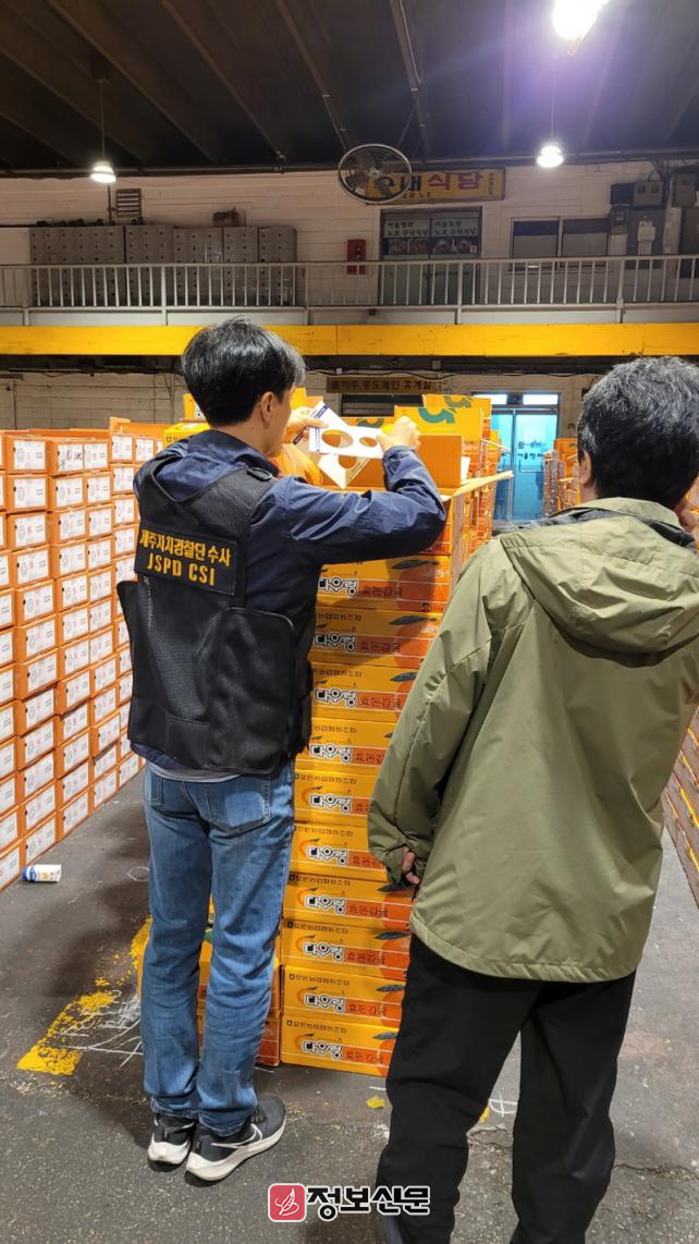 제주도는 14일부터 이틀간 자치경찰단, 수급관리센터, 행정시 등과 합동으로 3개조 10명의 합동단속반을 꾸려 서울 가락시장, 경기 구리시장, 대구 북부시장을 집중 점검했다. 전국 9대 도매시장 가운데 현재 감귤 반입량이 가장 많은 곳들이다.