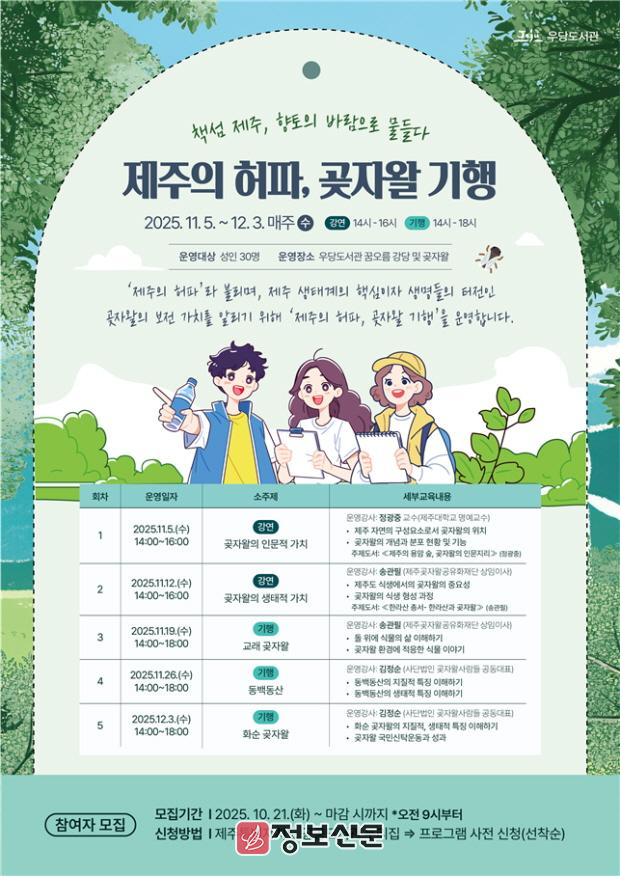 ▲1차시 ‘곶자왈의 인문적 가치’, ▲2차시 ‘곶자왈의 생태적 가치’에 대한 강연이 진행되며, 이후 ▲3차시 교래 곶자왈, ▲4차시 동백동산, ▲5차시 화순 곶자왈 등 제주를 대표하는 곶자왈 지역을 직접 탐방하는 현장 기행이 이어진다.