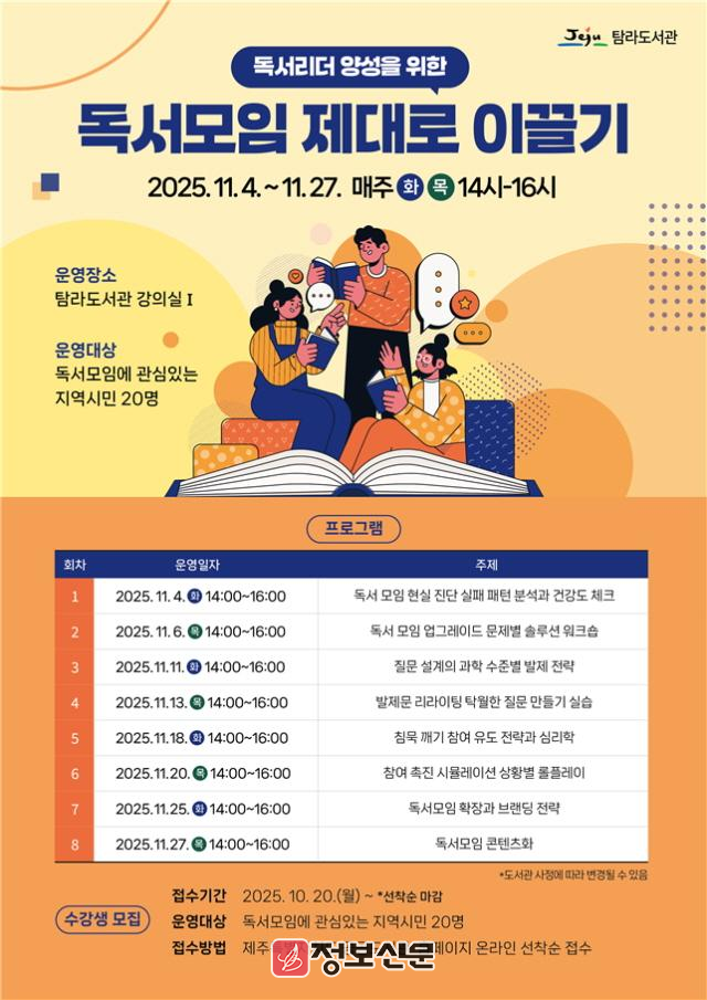 이번 강좌는 제주 시민 20명을 대상으로 오는 11월 4일부터 11월 27일까지 매주 화요일과 목요일 오후 2시 탐라도서관 강의실Ⅰ에서 운영된다. 강의는 ‘작가의 집’ 출판 플랫폼 황준연 대표가 맡아 실질적인 독서 모임 운영과 활성화를 목표로 8차시에 걸쳐 진행된다.