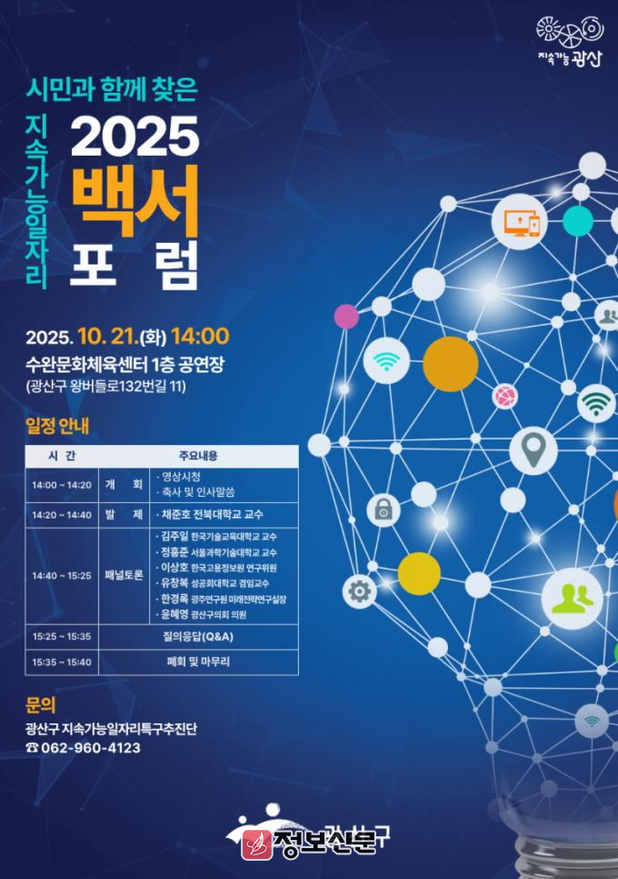 광주 광산구(구청장 박병규)는 21일 오후 2시부터 수완문화체육센터에서 '시민과 함께 찾은 지속가능 일자리'를 주제로 2025 지속가능 일자리 백서 포럼(공개토론회)을 개최한다고 밝혔다.
