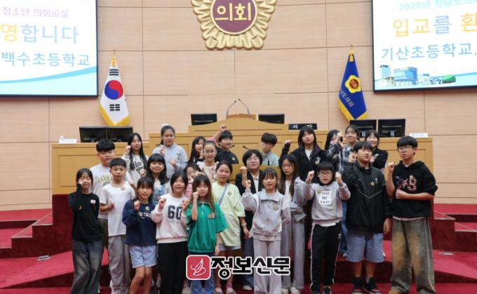 ![]() ▲ 10월 16일, 전라남도의회 본회의장에서 오미화 의원은 청소년의회교실에 참석한 백수초와 기산초 학생들에게 인사를 전하고 기념 촬영을 했다. |