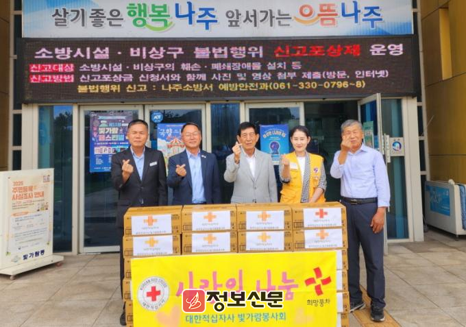 ![]() 적십자사봉사회 나주협의회, 빛가람동경로당에 ‘사랑의 쿠키’ 전달식 개최(왼쪽부터 김귀남 빛가람동장, 김강정 의회운영위원장, 이계택 빛가람동 노인회장, 손현화 적십자봉사회 나주지구협의회장, 김종완 대광로제비앙경로당 회장)