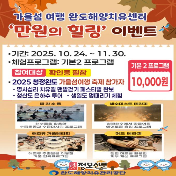 ‘만원의 힐링’ 이벤트는 ‘완도왔섬, 치유됐섬’을 주제로 개최되는 ‘2025 청정 완도 가을 섬 여행’을 하는 관광객이 가을 섬 여행과 함께 부담 없이 해양치유 프로그램을 즐길 수 있도록 마련됐다.