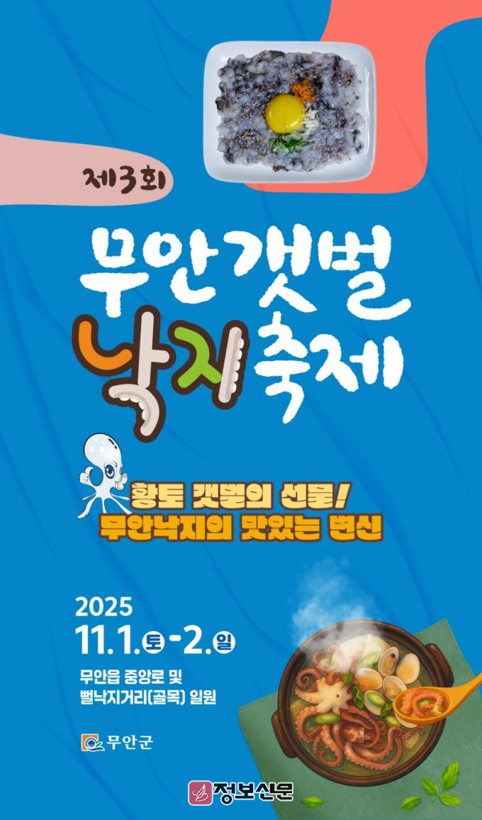 김산 군수는 “가을철 최고의 보양식이자 뻘밭의 산삼이라 불리는 무안 낙지를 비롯해, ‘집 나간 며느리도 돌아온다’는 전어와 제철 새우 등 풍성한 별미가 준비돼 있다”며, “이번 축제가 무안의 맛과 멋을 느끼는 특별한 시간이 되길 바란다”고 전했다.