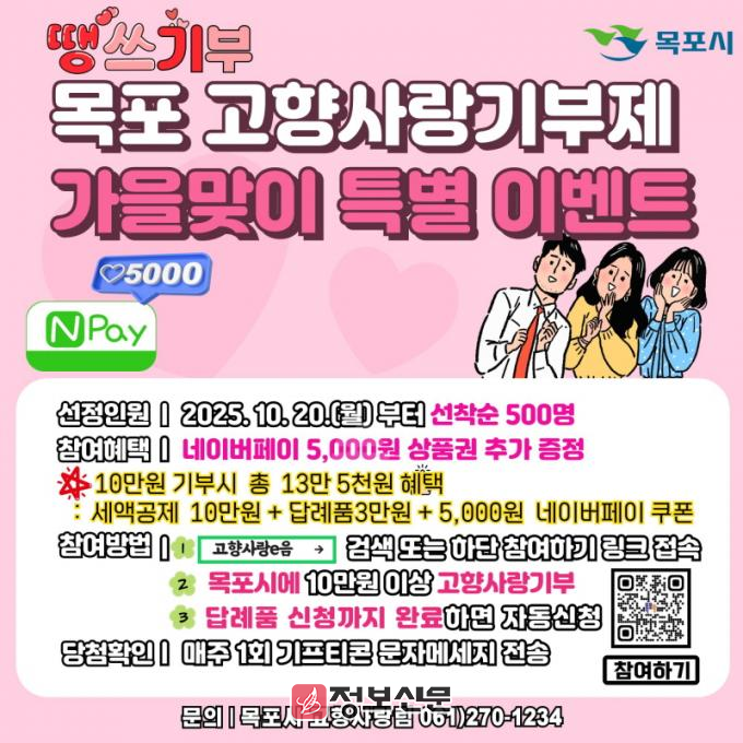 ![]() 목포시, 땡스기부~고향사랑기부제 가을맞이 특별 이벤트 추진 |