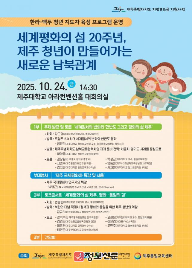 제주도가 주최하고 제주통일미래연구원(원장 고성준)과 제주통일교육센터(센터장 김일환)가 주관하는 이번 행사는 ‘제주 청년이 만들어가는 새로운 남북 관계’를 주제로, 경색된 남북관계 속에서도 한반도의 평화와 통일 비전을 모색하는 자리로 마련됐다.