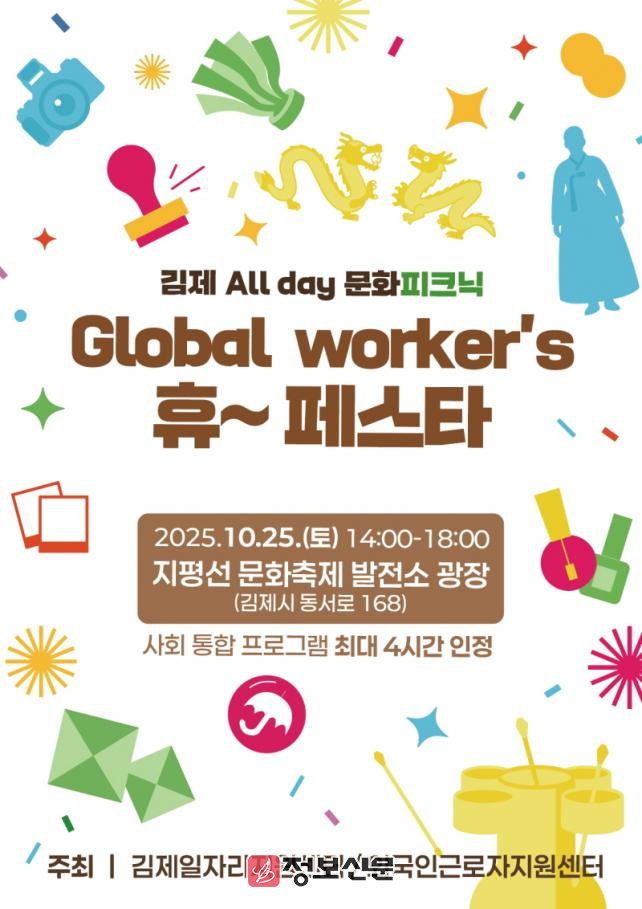 시는 오는 25일 오후 2시부터 6시까지 요촌동에 위치한 지평선문화축제발전소 광장(김제시 동서로 168)에서 외국인근로자와 시민이 함께 어울리는 문화교류 한마당 “김제 All day 문화피크닉 – Global worker’s 휴~페스타”를 개최한다고 밝혔다.