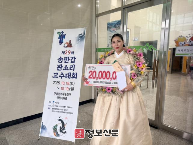 21일 익산시에 따르면, 이다은 명창은 최근 열린 '제29회 송만갑 판소리·고수대회'에서 명창부 대상인 대통령상을 수상하는 영예를 안았다.