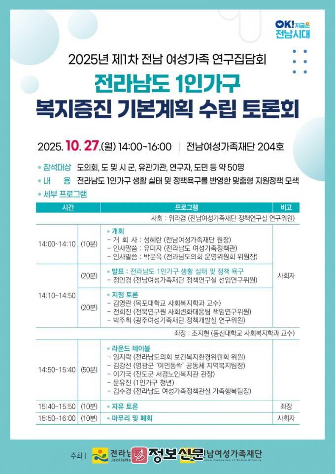 ![]() 전남여성가족재단, 전라남도 1인가구 복지증진 기본계획마련 위한 토론회 개최 |