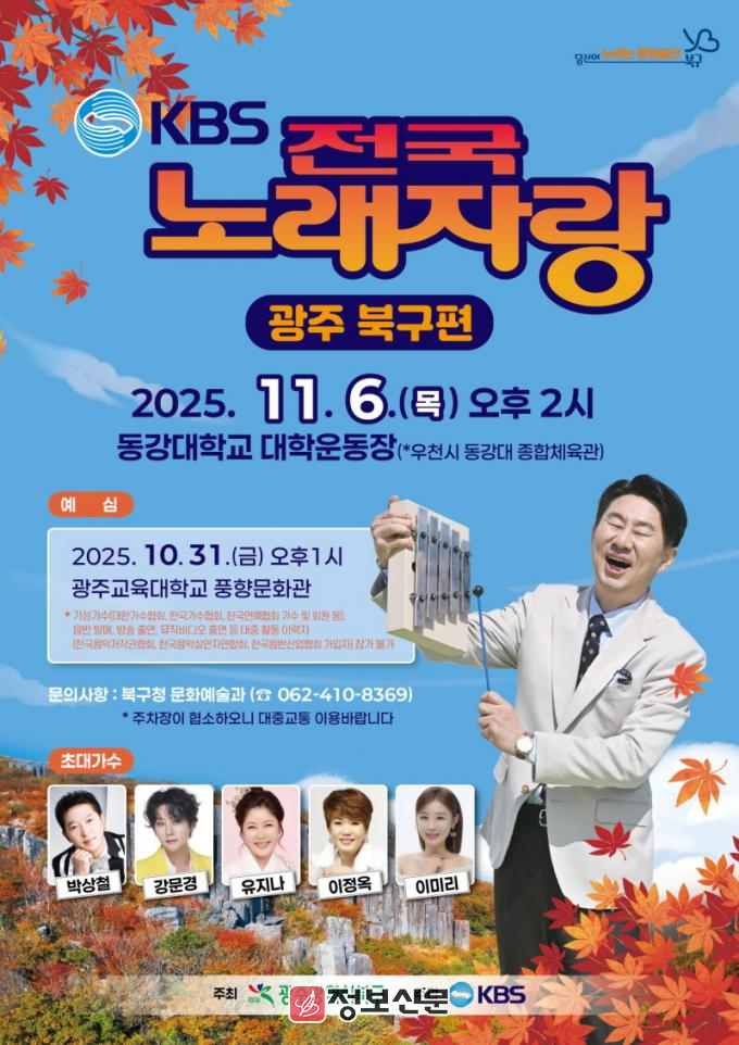 21일 북구에 따르면 오는 11월 6일 오후 2시부터 ‘KBS 전국노래자랑 광주 북구편’ 본선 녹화가 동강대학교 운동장에서 진행된다.