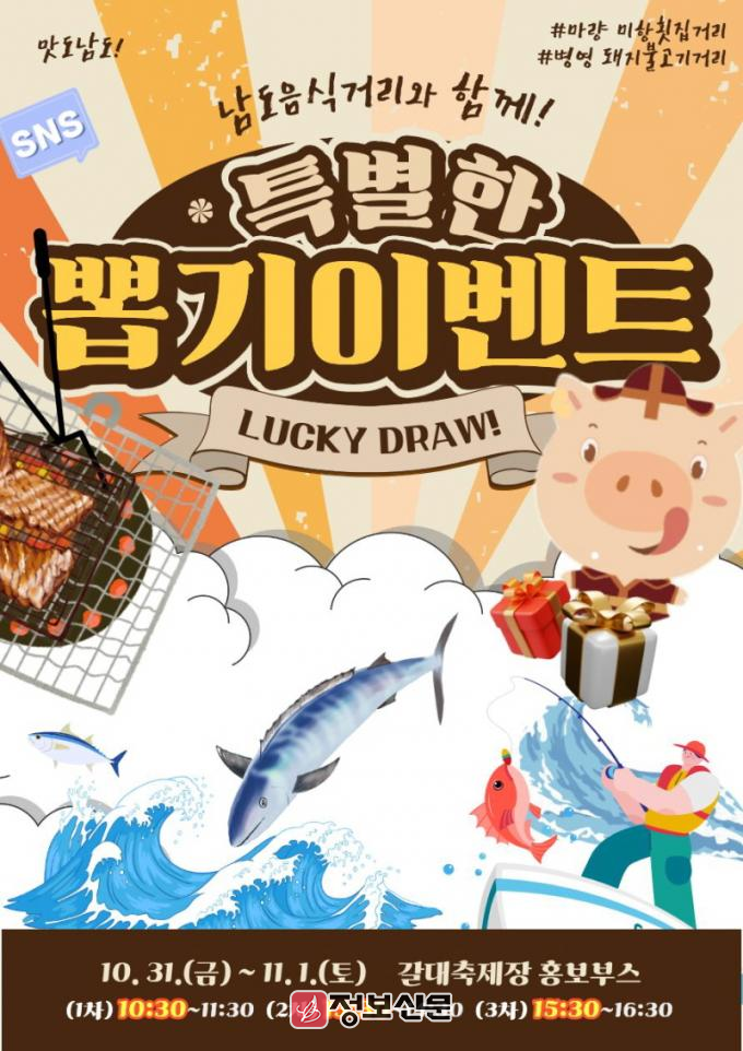 이벤트 운영시간은 1차 오전 10시30~11시30분 2차 오후 1시30~2시30분 3차 오후 3시30~4시30분이며, 회차당 참여 인원은 120명으로 제한된다. 상품으로는 남도음식거리 이미지가 들어간 다양한 기념품이며 꽝없는 이벤트로 누구나 소소한 행운을 누릴 수 있다.