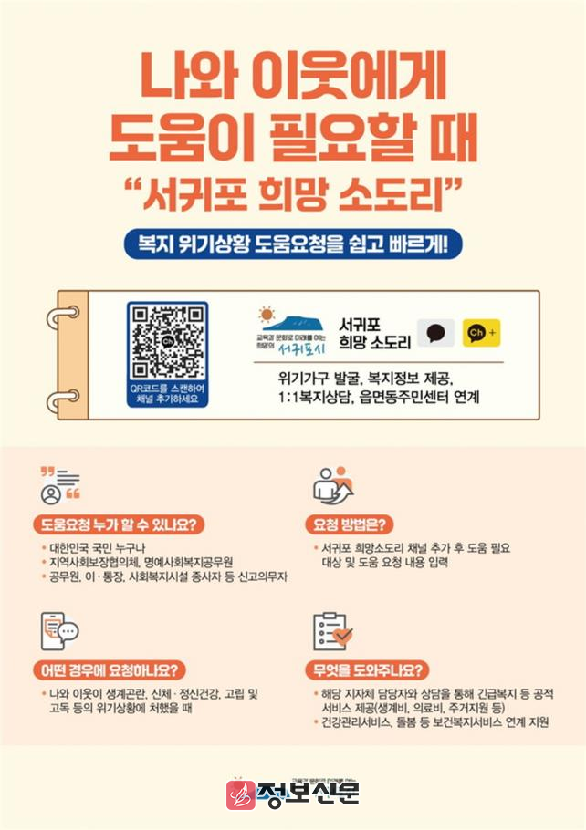 서귀포시 관계자는 “앞으로도 시민의 관심과 참여를 바탕으로 위기가구를 조기에 발굴하고, 필요한 지원이 신속하게 이루어질 수 있도록 채널 운영 및 활성화에 더욱 힘쓰겠다”라고 말했다.
