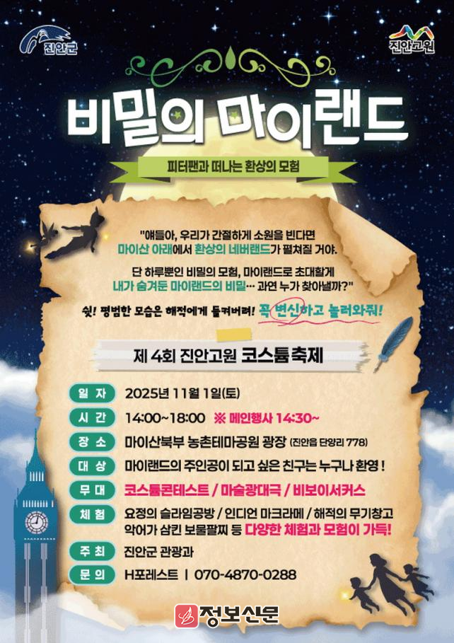 진안군 관계자는 “비밀의 마이랜드 축제는 마이산을 배경으로 펼쳐지는 특별한 코스튬 행사로, 전주·대전 등 인근 시군에서도 해마다 더 많은 분들이 찾아오고 있다”며 “주민과 관광객이 함께 어울려 즐기는 진안만의 신선하고 유쾌한 관광 축제인 만큼, 비밀의 마이랜드에서 특별한 가을날의 추억을 만들어 가시길 바란다”고 전했다.
