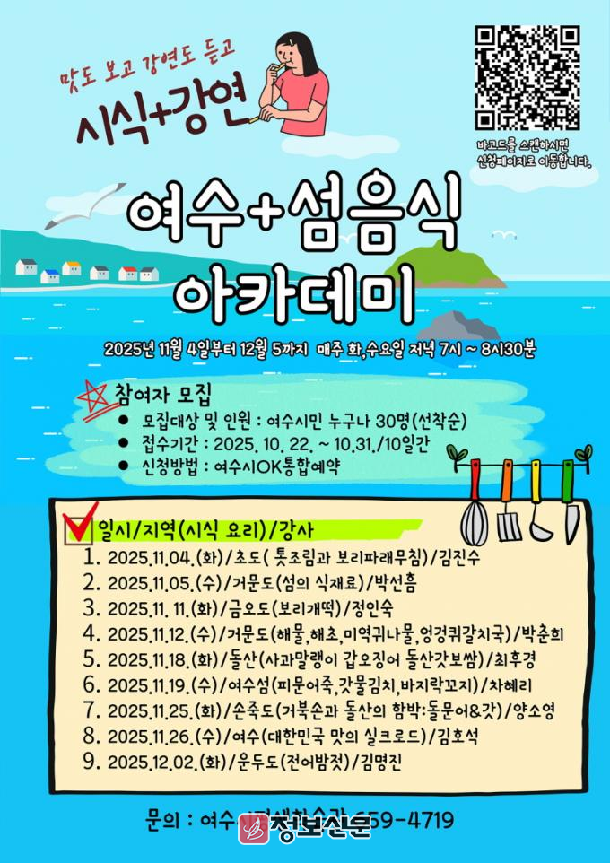 ![]() 여수시, ‘여수+섬음식 아카데미’ 참여자 모집 |