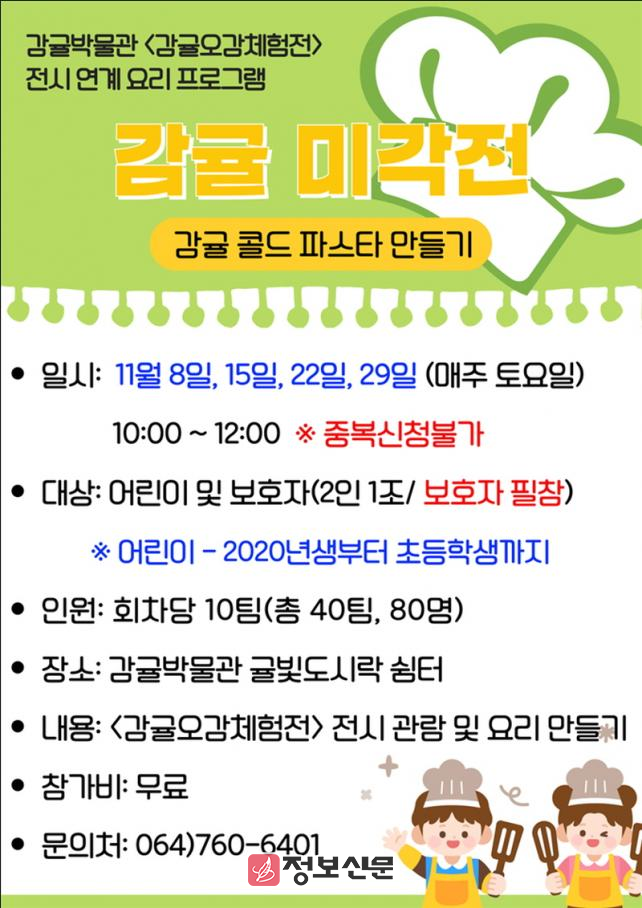 이번 프로그램은 <감귤오감체험전>의 주제인 오감(五感) 중 ‘미각’ 콘텐츠로 기획되었으며 11월 8일부터 29일까지 매주 토요일 감귤박물관 귤빛도시락 쉼터에서 진행된다. 수업은 쿠킹클래스카페 어썸 오현주 대표가 맡았으며, 참여자들은 학예사와 함께 전시를 관람한 뒤 감귤을 활용한 콜드 파스타를 직접 만들고 시식하는 시간을 갖는다.