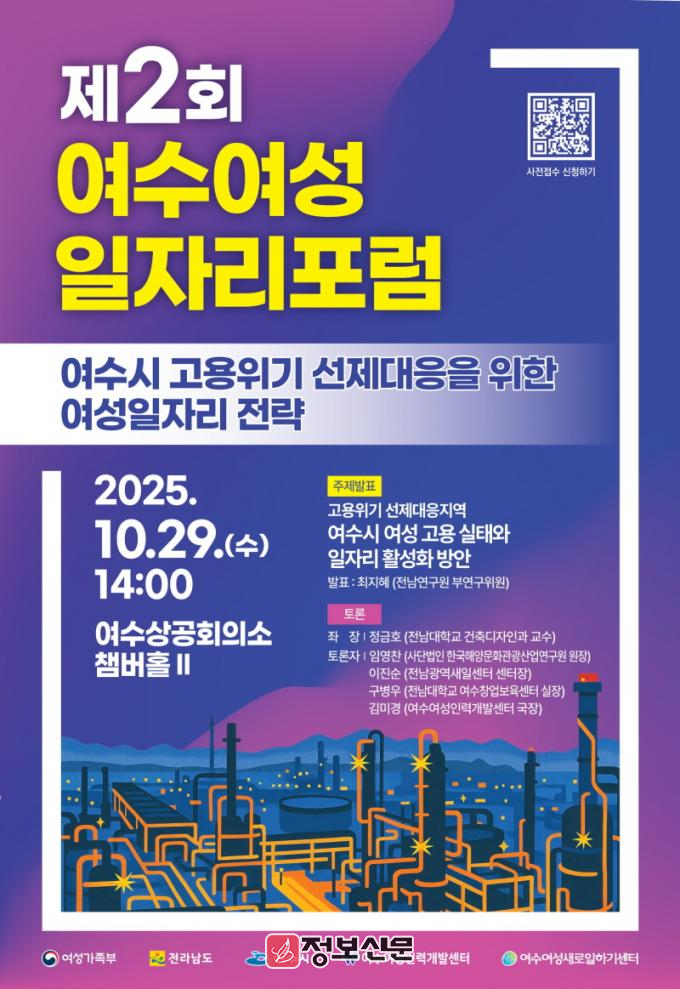 특히 이번 포럼은 지난 8월 28일 여수시가 ‘고용위기 선제대응지역’으로 지정된 이후 처음 열리는 포럼으로, 지역 고용위기 극복을 위한 여성 일자리 정책 방향을 심도 있게 모색하는 뜻깊은 자리가 될 예정이다.