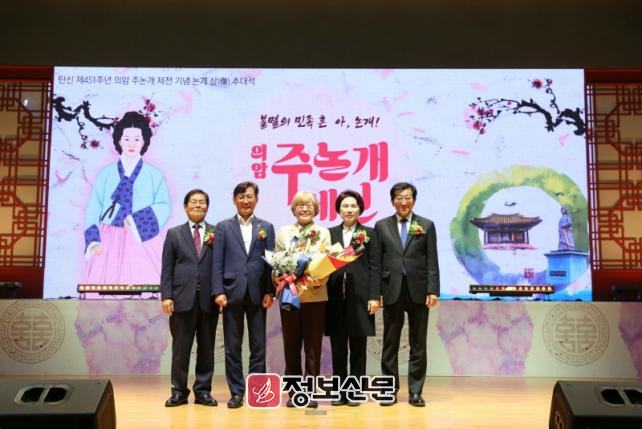 의암주논개상은 2007년부터 나라와 이웃을 위해 공헌한 한국 여성을 대상으로 전국에서 매년 선정해 논개상으로 추대하는 제도다. 올해로 18회를 맞이한 논개상에는 투철한 봉사정신으로 사회활동에 적극 앞장서 한국 여성의 귀감이 되는 인물이 선정된다.