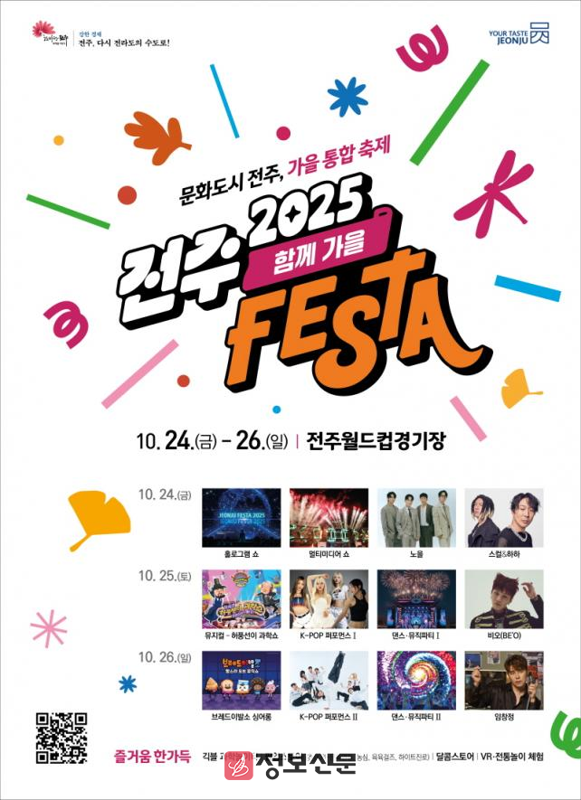노은영 전주시 문화체육관광국장은 “전주페스타 2025 축하행사 ‘함께가을’에서는 누구나 가족, 친구, 연인 등과 함께 즐길 수 있도록 다양한 콘텐츠를 준비했다”면서 “이번 행사를 통해 누구나 전주 가을의 낭만과 재미를 모두 만끽할 수 있기를 바란다”고 말했다.
