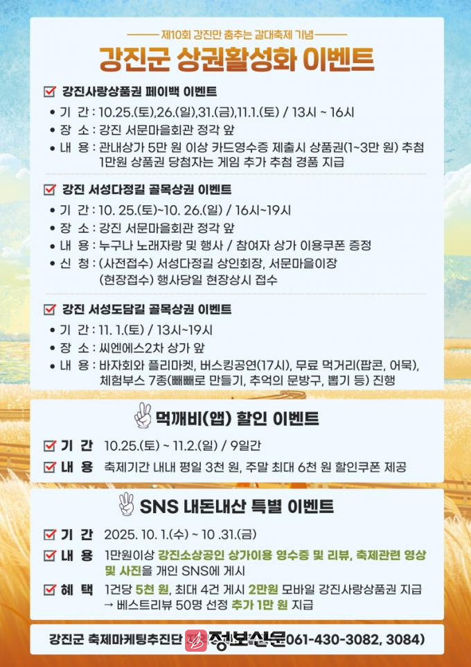 이번 이벤트는 상가 방문객 및 소비 촉진을 유도해 진읍 골목상권의 활력을 불어넣기 위해 진행되며, 주요 이벤트로는 강진사랑상품권 페이백 이벤트, 강진 서성다정길 골목상권 이벤트, 강진 서성도담길 골목상권 이벤트, ‘강진맛깨비’ 먹깨비 할인 이벤트, SNS 내돈내산 특별 이벤트 등이 있다.