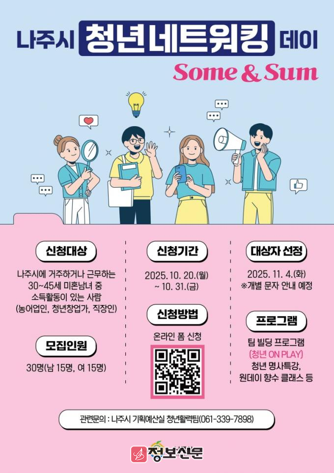 ![]() 나주시, 미혼청년 위한 ‘청년 네트워킹 데이’ 참가자 모집 |