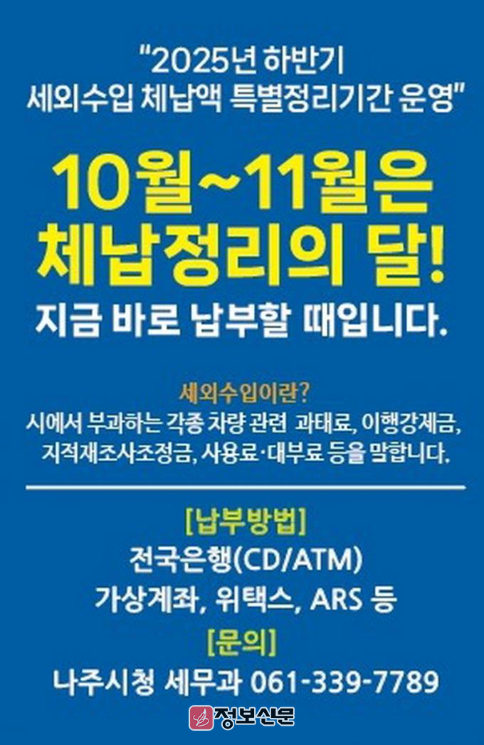 나주시 관계자는 “세외수입은 지방세와 함께 지역 발전을 위한 주요 재원”이라며 “경제 여건을 고려한 맞춤형 체납 관리로 시민 부담을 줄이고 공정한 납세 문화 확립과 건전한 재정 운영에 최선을 다하겠다”고 말했다.