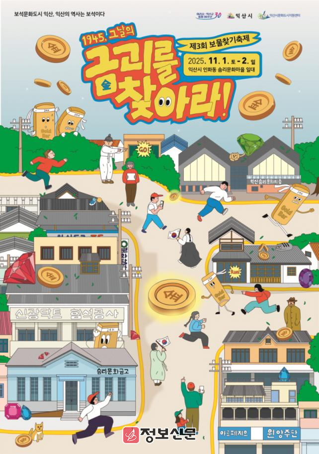 익산시와 익산시문화도시지원센터는 오는 11월 1~2일 오전 10시부터 오후 6시까지 인화동 솜리문화마을 일대에서 '2025 제3회 보물찾기축제-금괴를 찾아라'를 개최한다고 27일 밝혔다.
