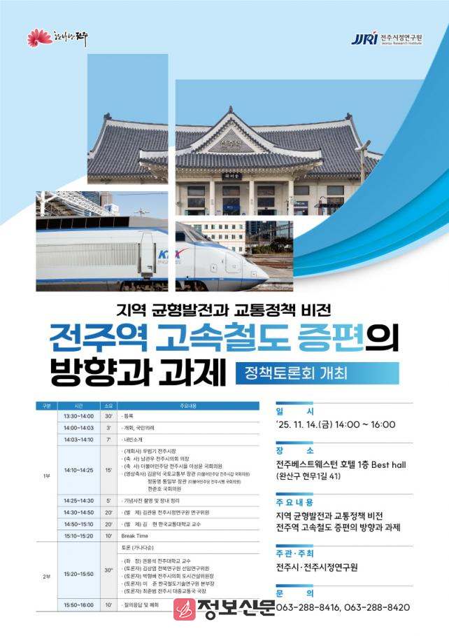 전주시와 전주시정연구원은 오는 11월 14일 오후 2시, 베스트웨스턴플러스 전주호텔 1층 베스트홀(완산구 현무1길 41)에서 ‘지역 균형발전과 교통정책 비전-전주역 고속철도 증편 방향과 과제’를 주제로 정책토론회를 개최한다.