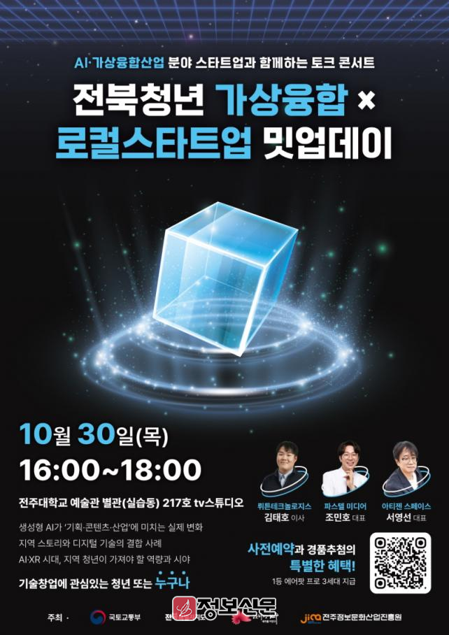 전주정보문화산업진흥원(원장 허전)은 오는 30일 전주대학교 예술관 별관 217호에서 지역 내 첨단 디지털 융합기술 창업 활성화를 위한 ‘전북청년 가상융합×로컬스타트업 밋업데이’ 토크콘서트를 개최한다.