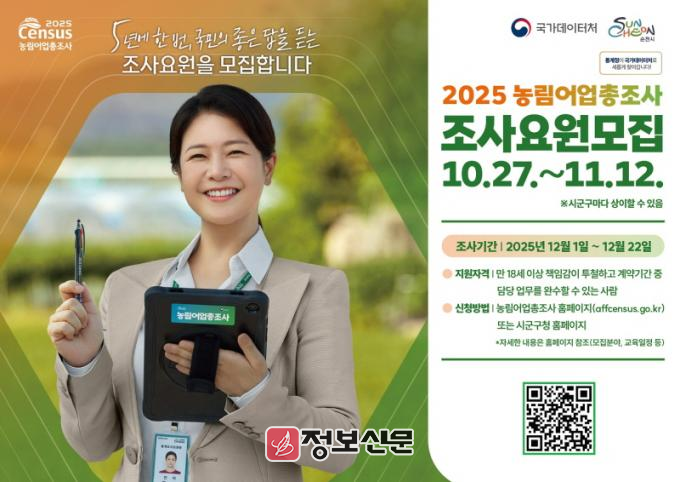 모집 공고는 2025 농림어업총조사 홈페이지와 순천시 홈페이지를 통해 확인할 수 있으며, 11월 12일까지 농림어업총조사 홈페이지 또는 순천시 디지털정책과로 방문 접수하면 된다.