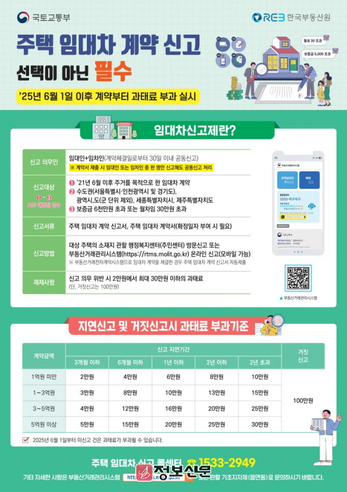 신고 의무를 위반하면 임대인과 임차인 각각 2만 원에서 최대 30만 원까지, 거짓 신고 시에는 최대 100만 원의 과태료가 부과된다. 다만 ▲전입신고를 한 경우 ▲공공주택사업자 및 임대사업자가 신고한 경우는 과태료 부과 대상에서 제외된다.