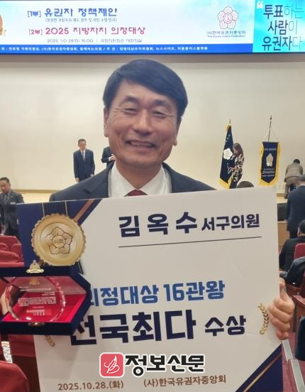 이에 김옥수 의원은“이 상은 저 혼자 이룬 것이 아니라, 함께 노력해 주신 구민들 덕분에 가능했다”며, “앞으로도 서구 구민들에게 행복한 서구, 살고 싶은 서구를 만들기 위해 더욱 헌신적인 의정활동을 펼쳐 나가겠다”고 수상소감을 밝혔다.